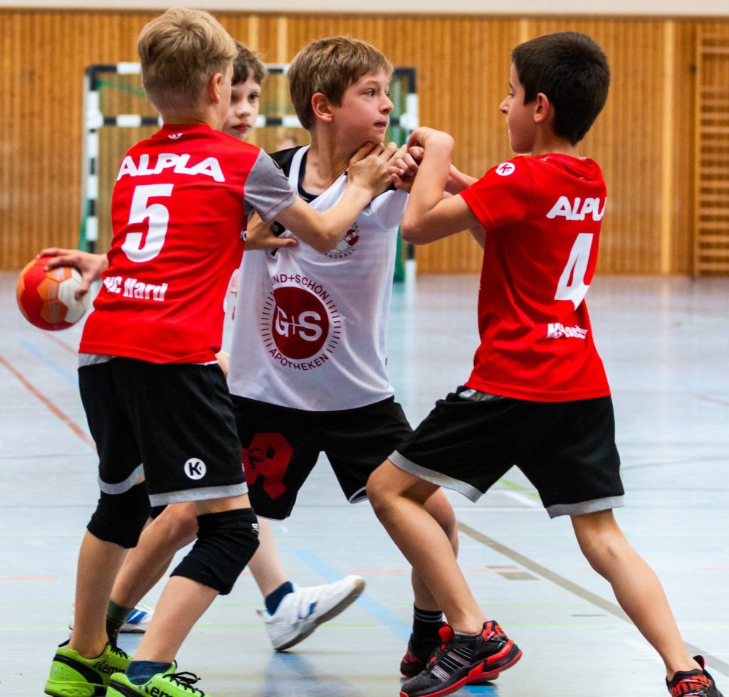 18 Mannschaften a 14 Kinder plus deren Eltern tummelten sich am Sonntag, 26.05.2019 von 9 – 14 Uhr in den Wiblinger Hallen der Stadt Ulm. Das Sichtungsturnier der E – Jugend des Bezirkes Bodensee-Donau stand auf dem Plan. 250 Jungen und Mädchen aus Ulm, Wangen, Biberach, Ravensburg, Laichingen, Baustein, Laupheim, Gerhausen, Hard, Ailingen und Bad Saulgau kämpften um den Ball und hatten richtig viel Spaß dabei. Mit gleich drei teilnehmenden Mannschaften war die SG Ulm & Wiblingen am stärksten vertreten. Die Sichtung gehört zu einer Qualifikation, die von Deutschen Handballbund vorgeschrieben ist. Hier wird eingeschätzt, ob die Kinder schon in der Lage sind, auf das große „richtige“ Handballfeld zu spielen. Die Organisation und Verköstigung des Turniers durch die SG Ulm & Wiblingen wurde von allen hochgelobt. Unser Kooperationspartner, die AOK Ulm-Biberach, war ebenfalls mit einem Stand vertreten, an dem die Kinder ihre Reaktionsschnelligkeit unter Beweis stellen konnten.