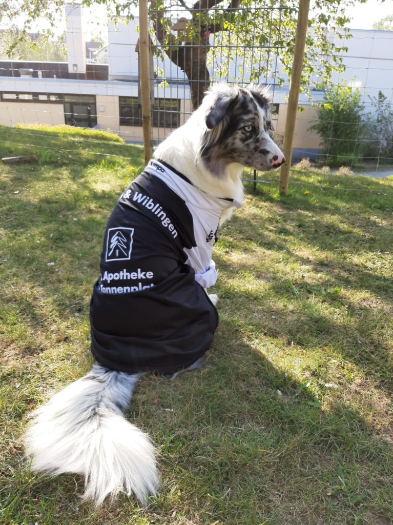 Sie heißt Liv und ist eine ca 1 jährige Australian Shepherd Hündin und hat genau unsere Vereins Farben. Das war der Grund, dass Lena auf die Idee kam, ihr die Weste anzuziehen.