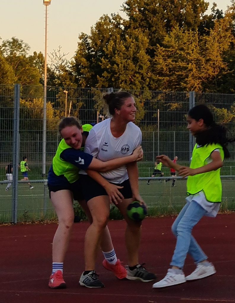 Nach ein paar Worten der Trainer war schnell klar, die Mädchen wollen Handball spielen und zwar gegen die Eltern. Trainerin Dinah ist auch Eltern, deshalb pfiff Pauli und Andi war der Wechselcoach. Alle hatten großen Spaß. Lustig anzusehen war es, wenn die Mädchen in die Lücken der Elternabwehr wollten. Da vor allem die Väter mehr Breite aufs Feld stellten, war da meist keine Lücke mehr. So prallten die Mädchen nur ab. Besonders engagierte Väter boten beim Torwurf Pirouetten und sogar einen Kempa. Gezählt hat keiner, doch Tore fielen reichlich, obwohl Tochter und Vater Torwart gut standen.