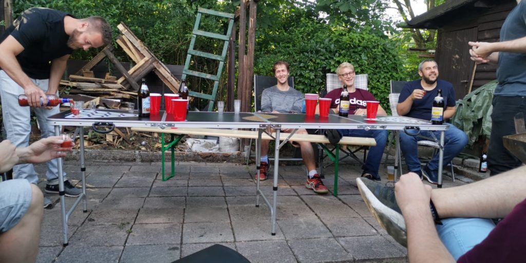Auch die sportliche Betätigung durfte an so einem gemütlichen Abend natürlich nicht fehlen. Ein Glück, dass ein Bierpong-Tisch länger als 1,50m ist. So konnte mit ausreichen Abstand und nach Einnahme weiterer Flüssigkeiten zur Verbesserung der Zielsicherheit der sportliche Ehrgeiz bei vielen Runden Bierpong befriedigt werden.