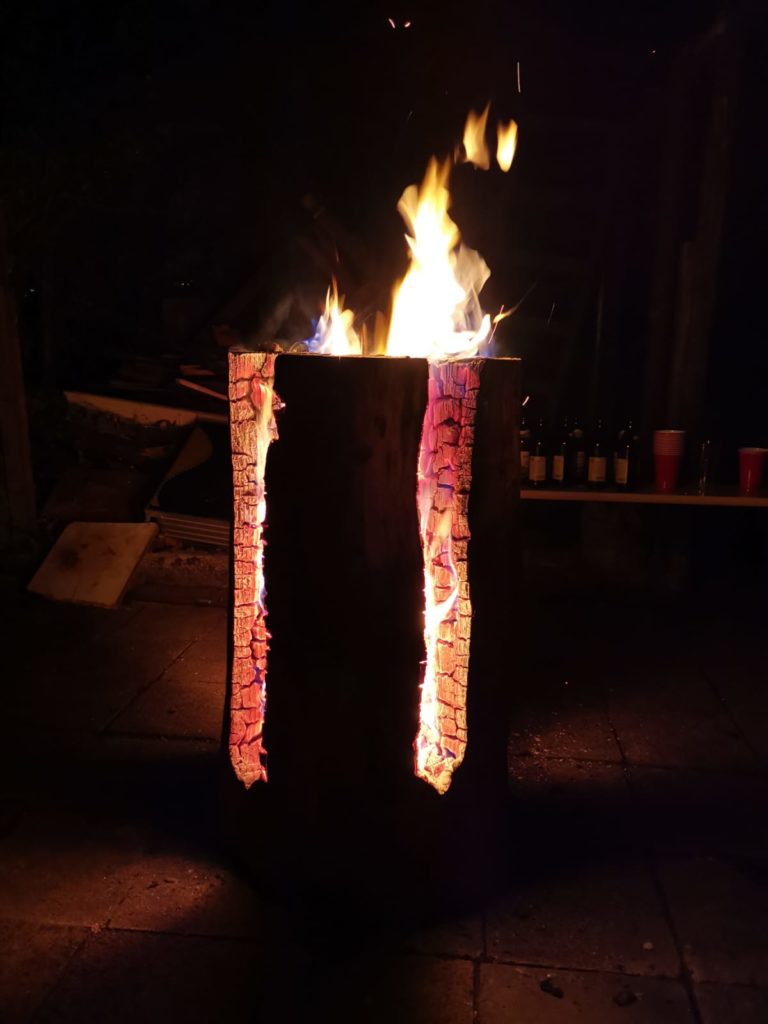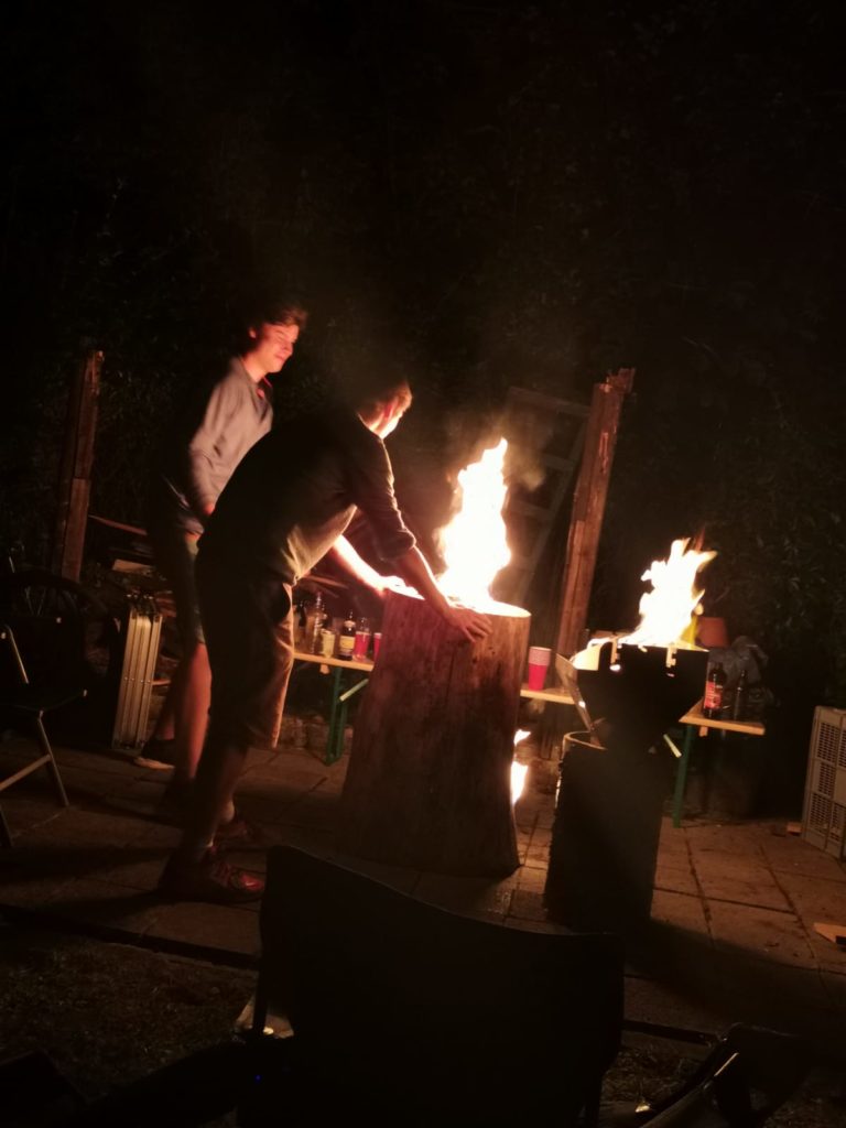 Mit hereinbrechender Dunkelheit und abnehmenden Temperaturen wurde ein kleines Feuerchen gemacht, um sowohl ein wenig Helligkeit für die Zielwurfübungen zu erhalten, als auch die Körpertemperatur der Mannen, welche durch das Trinken isotonischer Kaltgetränke schon etwas abgenommen hatte, nicht noch weiter absinken zu lassen. Bei guten Gesprächen und einigen mehr oder minder guten Gesangseinlagen nahm die Nacht ihren Lauf. Zu später Stunde wurde ein Schwedenfeuer entfacht, welches einige der Feierwütigen daran erinnerte, dass es langsam an der Zeit war, den Heimweg anzutreten. Auf ihren Drahteseln fuhren die meisten dem Bett und dem Morgengrauen entgegen, andere schoben das Zweirad lieber, um keine Verletzungen zu riskieren. Die letzten Flammen des Schwedenfeuers beendeten das Gartenfest und am nächsten Tag erinnerte nur noch ein kleiner Haufen Kohle (und jede Menge leerer Flaschen) an die gelungene Nacht.